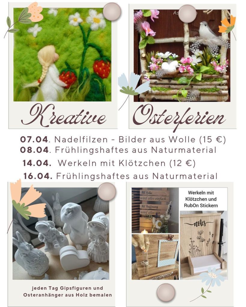 Freut ihr euch auch schon so sehr wie wir auf die Osterferien? Für alle, die nicht in den Urlaub fahren haben wir uns ein buntes Programm ausgedacht. Unter dem Motto „kreativer Frühling“ könnt ihr euch beim Nadelfilzen, Basteln mit Naturmaterialien oder Werkeln mit Klötzchen austoben. Natürlich können auch wieder tolle Gipsfiguren und Osteranhänger aus Holz bemalt werden.