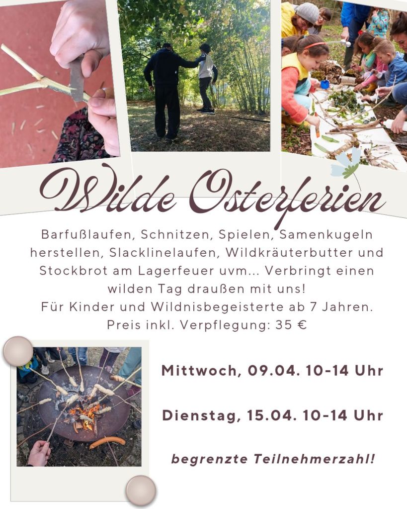 Und als besonderes Highlight wollen wir in jeder Ferienwoche einen Wildnistag ausrichten. Wir freuen uns schon riesig darauf, mit euch zu toben und zu basteln. Meldet euch, wenn ihr mitmachen wollt. Für die Wilden Osterferien sind nur begrenzt Plätze zur Verfügung. Eine Anmeldung ist hier unbedingt notwendig.