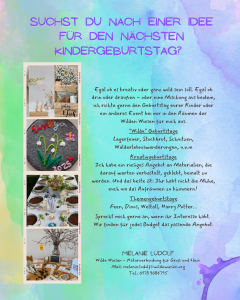 Ich bin Melanie – Wildnispädagogin und 4fache Mama – und ich richte gerne den Geburtstag eurer Kinder bei mir in den Räumen des Altjeßnitzer Familiennests (06800 Raguhn-Jeßnitz) für euch aus, komme aber auch gerne zu euch und wir stormern durch den Wald und übers Feld, entdecken gemeinsam die Natur vor der Haustür oder da wo ihr schon immer Mal langstromern wolltet.